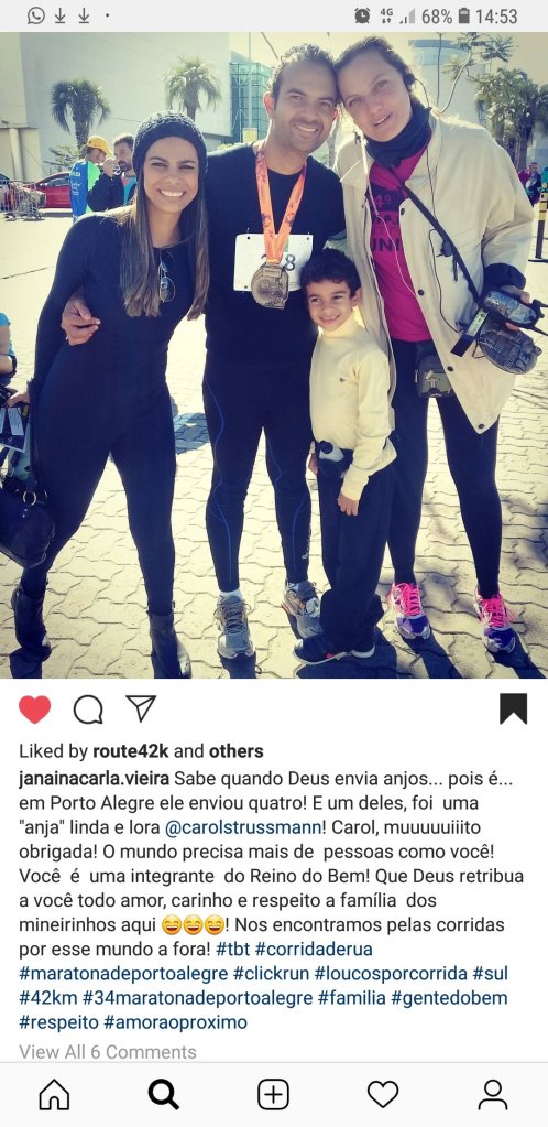 Domingo foi dia de Maratona. Este evento faz parte da história da minha vida. Dos piores e melhores momentos dela. De certeza, só a convicção de que o esporte pode sim mudar o mundo. Nesta edição, vai ficar ainda uma boa lembrança: a de que o pau de enchente aqui conseguiu fazer a diferença na vida de uma família mineira. Na véspera da prova, ajudei em algo simples, mas que para eles era muito importante. Era um casal com um filho de 6 anos. O menino me comoveu, lembrei do meu afilhado, pelo qual alimento amor infinito e por quem eu moveria montanhas, se necessário fosse. Tentei e deu certo. O pai do garoto completou sua primeira maratona. No final eles me encontraram – ou o que sobrou de mim – e pediram para tirar uma foto. Este gesto foi para mim a confirmação de que eu devo sim continuar a ser um “pau de enchente”. Não interessa se o mundo é bruto e mau. Eu não quero ser assim. Vou continuar fazendo o que eu acho certo.