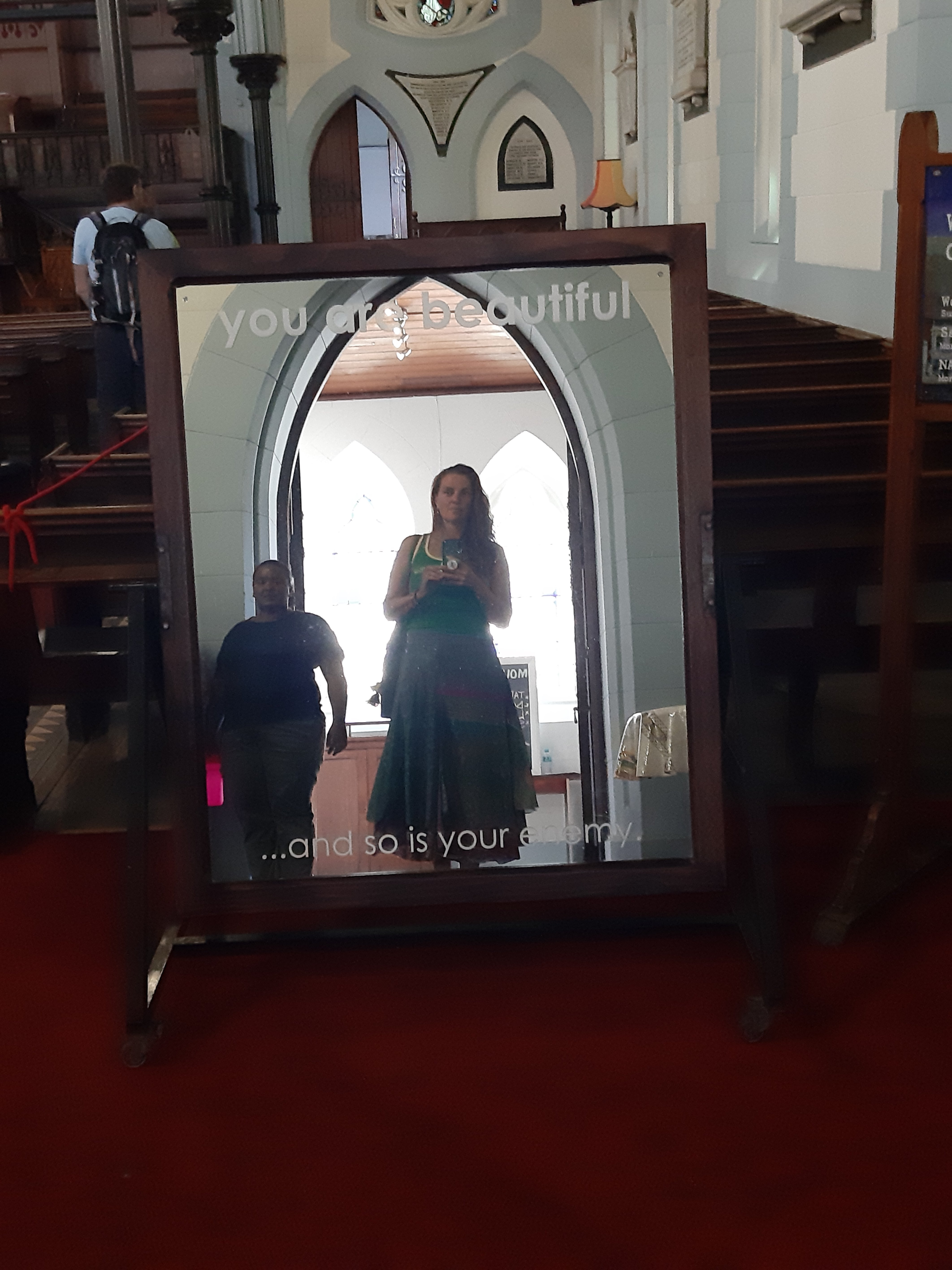 Entrei em uma Igreja e bem no meu caminho havia um espelho bem grande no qual estava escrito em cima: “you are beautiful” e, na parte de baixo a frase continuava em letras menores: ” …and so is your enemy”. Você é linda e isso é seu enimigo – esta foi a tradução que fiz na hora!Eu fiquei encantada, provocada, pensativa!